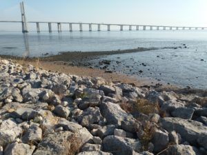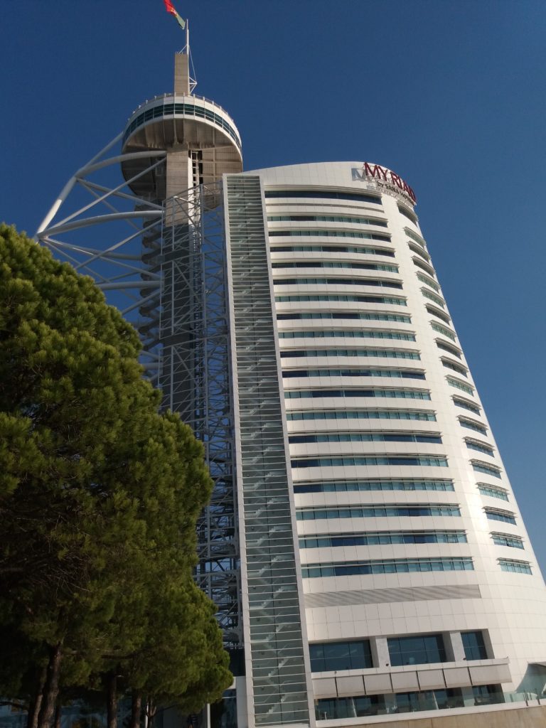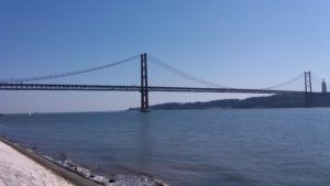 Nad rzekę Tag pojechaliśmy już o poranku pierwszego dnia naszego pobytu w Lizbonie. Pogoda była piękna, było cieplutko. Nad rzeką zobaczyliśmy 145- metrową wieżę do której przylegał luksusowy hotel. Z brzegu rzeki rozpościerał się widok na słynny 17- kilometrowy most Vasco da Gama. Most łączący Lizbonę z miejscowością Montijo.