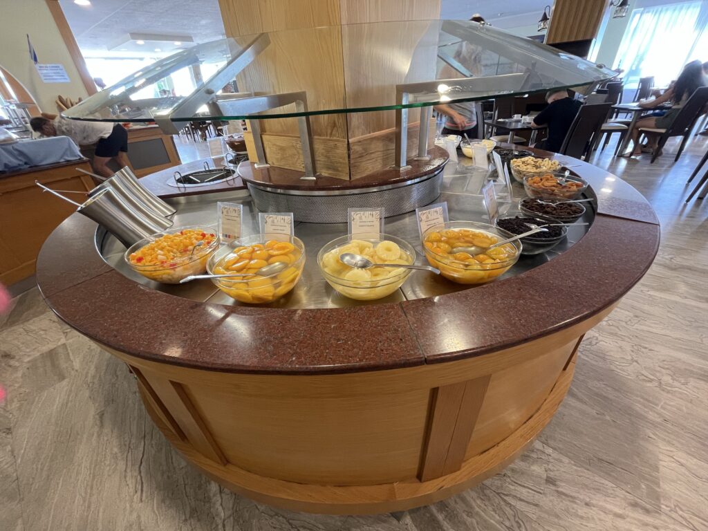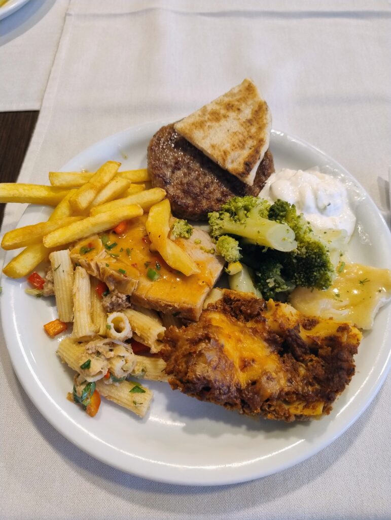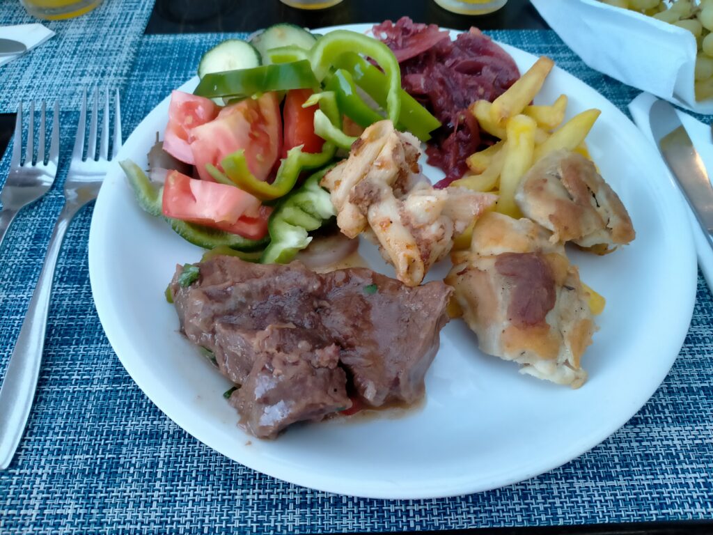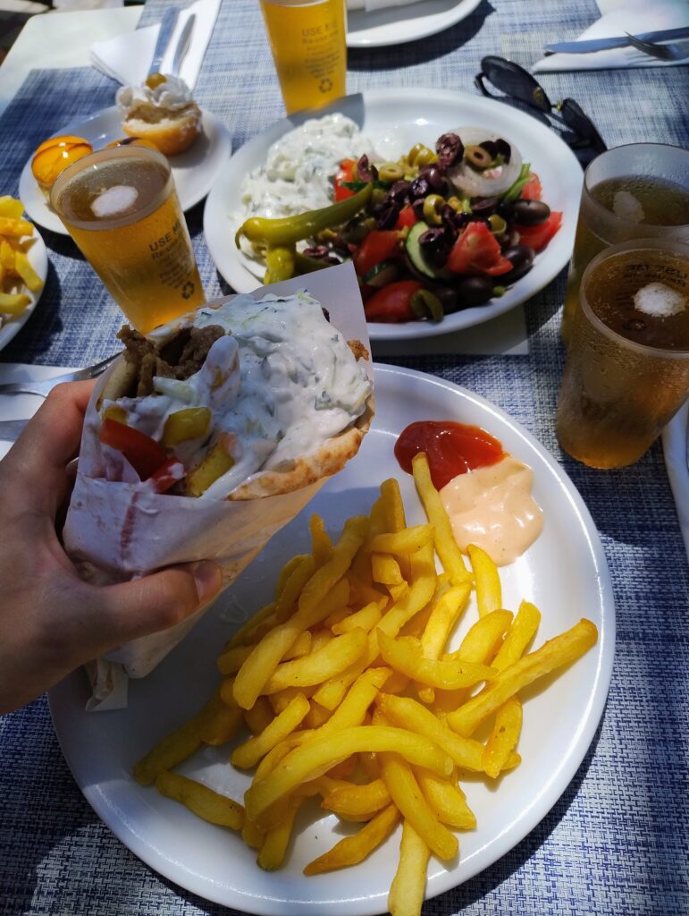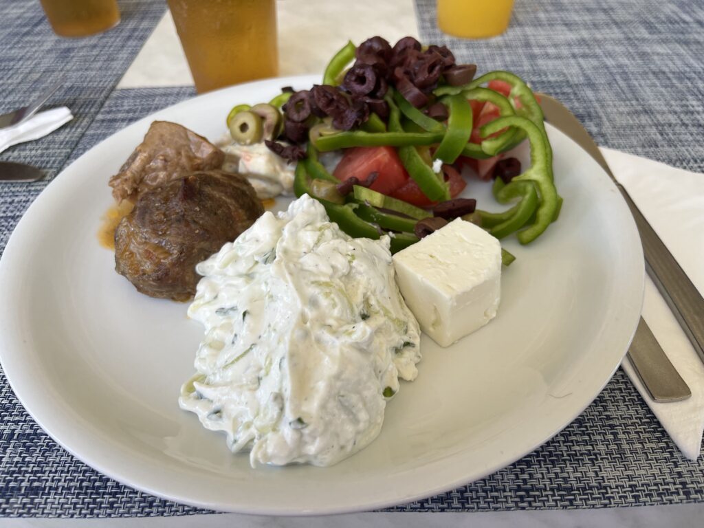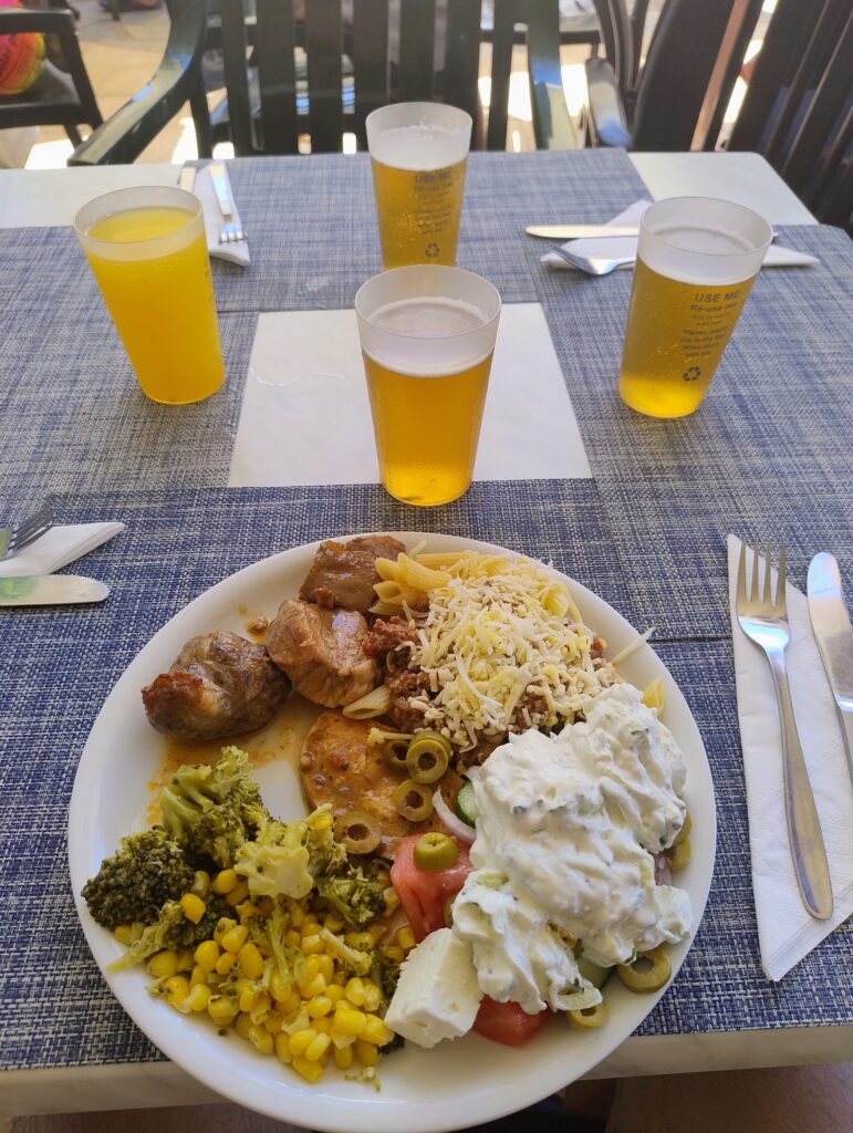 Jedzenie w hotelu pyszne, ogromny wybór dań. Serwowane od rana do wieczora. Mięsa, ryby, owoce morza, frytki, makarony, warzywa, przepyszny ser feta, fantastyczna sałatka grecka, oliwki, sery, wędliny, zapiekanki, zupy, gotowane warzywa, owoce, jogurty, torty, desery, ciasta, ciasteczka. Wszystkie potrawy pięknie podane. Do samego końca posiłków donoszone były różne potrawy. Gdy pewnego wieczoru, po dniu spędzonym na zwiedzaniu wyspy, przyszliśmy na kolację po godz. 21, to jedzenia było jeszcze naprawdę sporo. Dużym udogodnieniem dla gości jest to, że mogą sobie wybrać miejsce na posiłek w restauracji głównej w hotelu lub w restauracji na świeżym powietrzu przy basenie. My śniadania i kolacje jedliśmy w restauracji głównej, a obiady w restauracji przy basenie, gdyż tak nam było wygodniej. Nie trzeba było się specjalnie przebierać do obiadu, a poza tym restauracja przy basenie serwowała codziennie pyszną pitę gyros prosto z grilla, czego w restauracji głównej nie było.