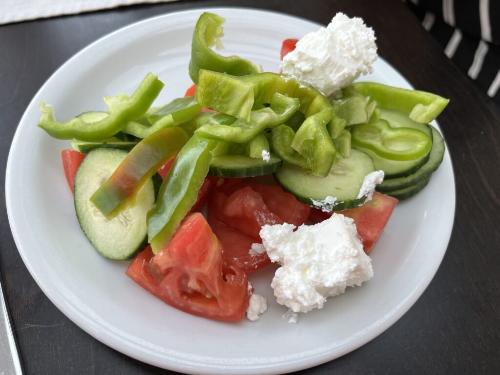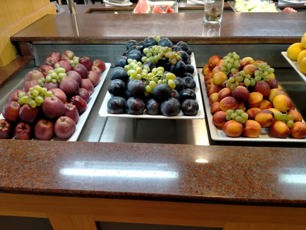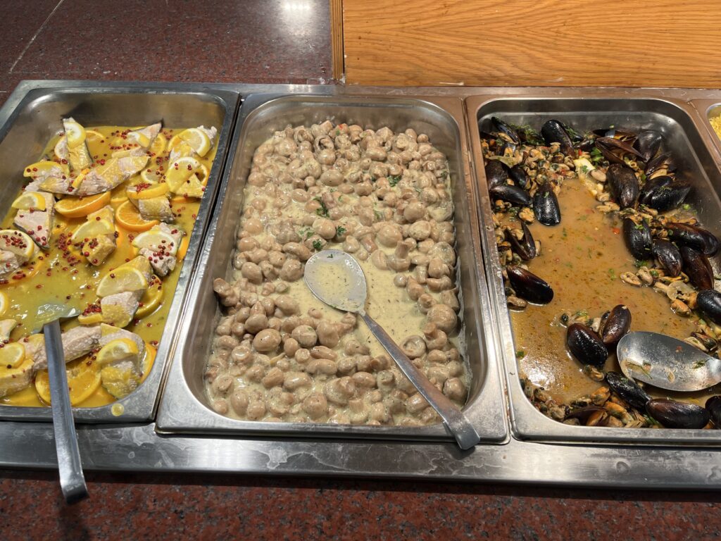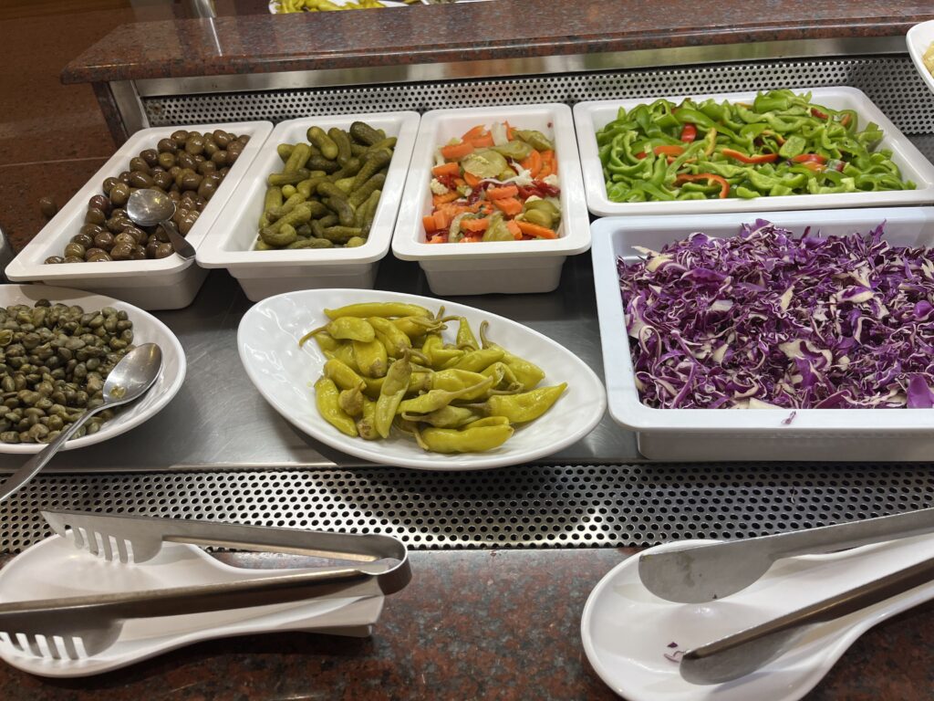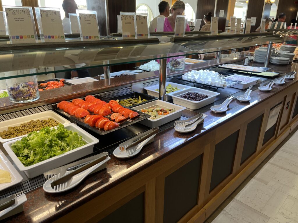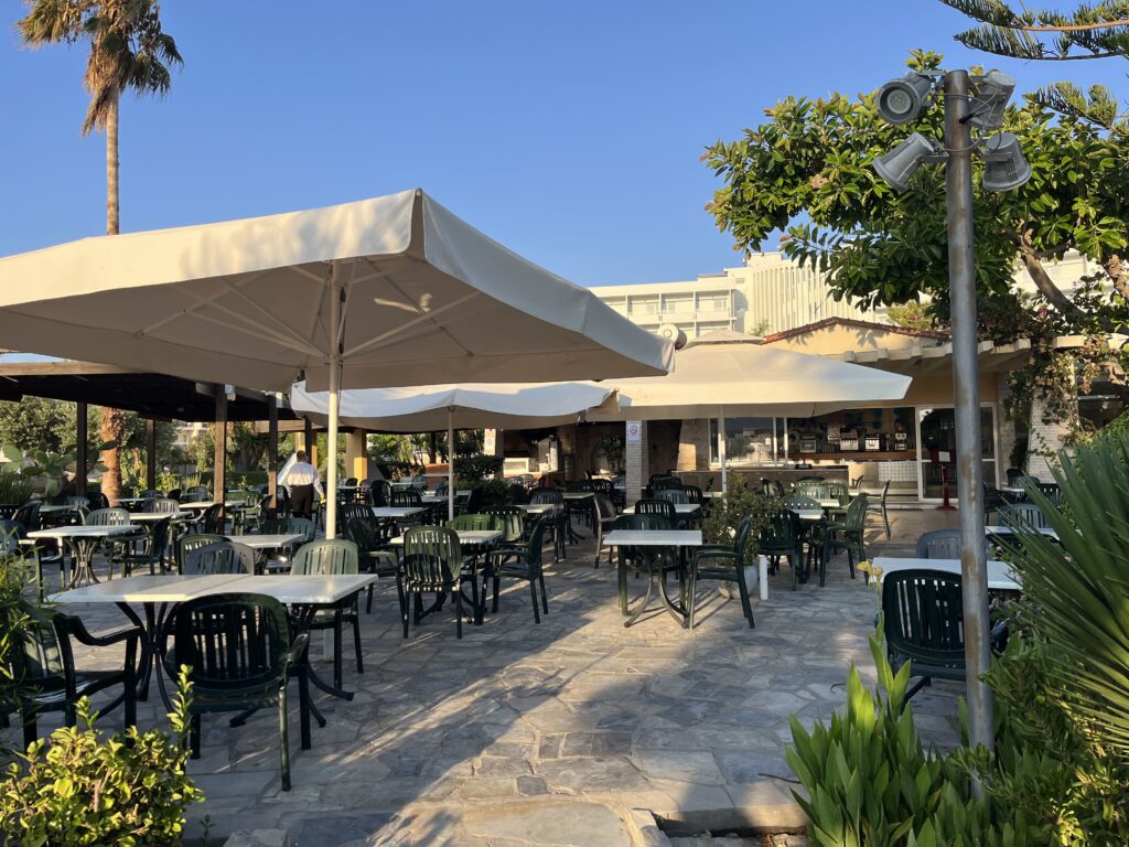 Jedzenie w hotelu pyszne, ogromny wybór dań. Serwowane od rana do wieczora. Mięsa, ryby, owoce morza, frytki, makarony, warzywa, przepyszny ser feta, fantastyczna sałatka grecka, oliwki, sery, wędliny, zapiekanki, zupy, gotowane warzywa, owoce, jogurty, torty, desery, ciasta, ciasteczka. Wszystkie potrawy pięknie podane. Do samego końca posiłków donoszone były różne potrawy. Gdy pewnego wieczoru, po dniu spędzonym na zwiedzaniu wyspy, przyszliśmy na kolację po godz. 21, to jedzenia było jeszcze naprawdę sporo. Dużym udogodnieniem dla gości jest to, że mogą sobie wybrać miejsce na posiłek w restauracji głównej w hotelu lub w restauracji na świeżym powietrzu przy basenie. My śniadania i kolacje jedliśmy w restauracji głównej, a obiady w restauracji przy basenie, gdyż tak nam było wygodniej. Nie trzeba było się specjalnie przebierać do obiadu, a poza tym restauracja przy basenie serwowała codziennie pyszną pitę gyros prosto z grilla, czego w restauracji głównej nie było.