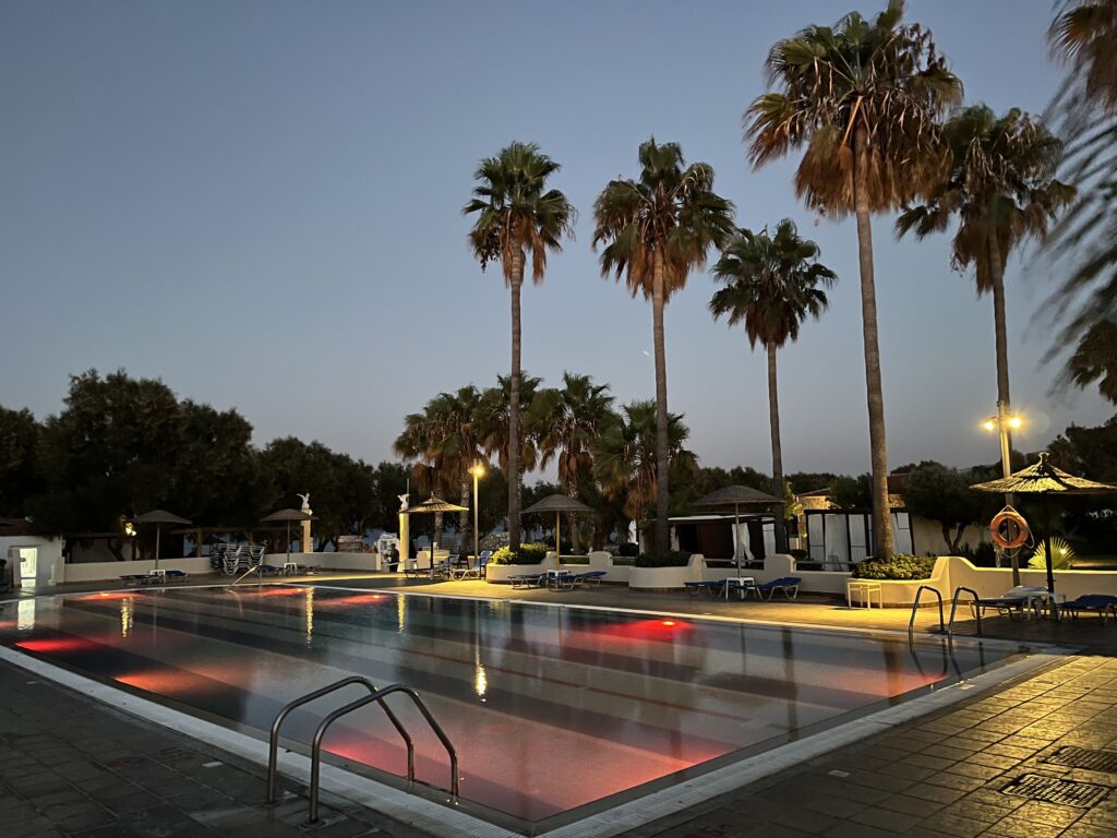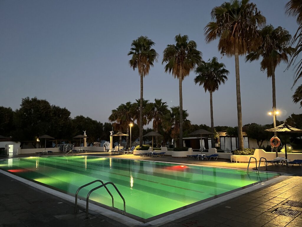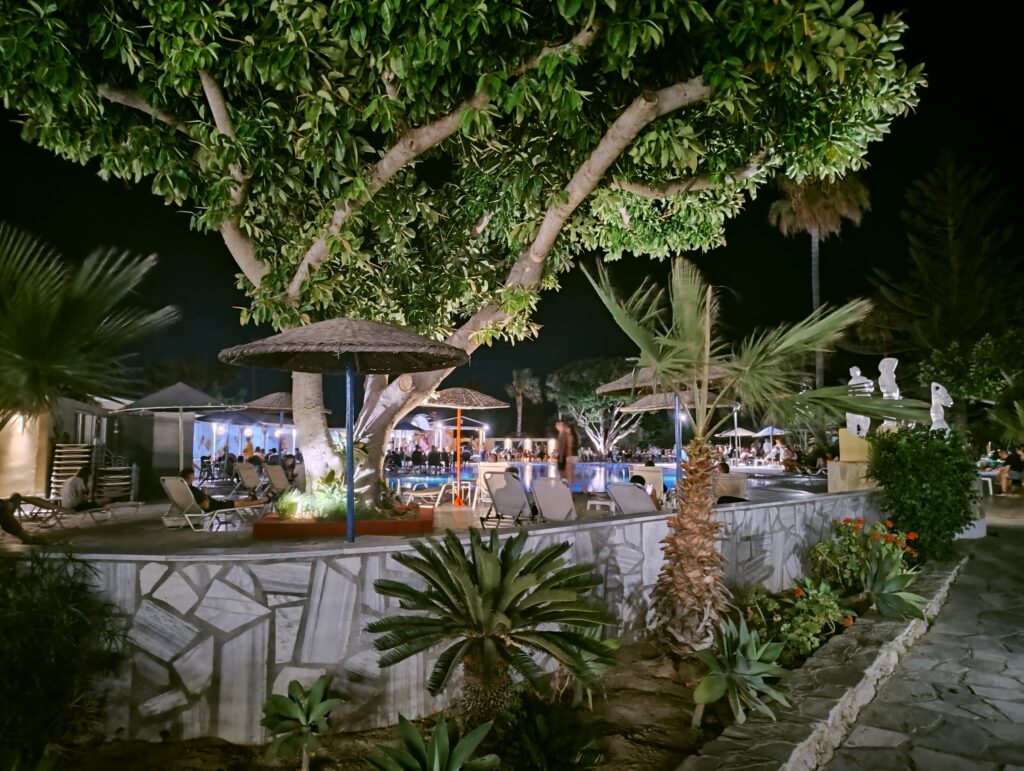 Nie warto zajmować sobie leżaków przed godziną 8:00 rano, ponieważ raz tak zrobiliśmy wracając w nocy z klubu karaoke i gdy przyszliśmy po śniadaniu, to na naszych leżakach nie było ręczników. Odnaleźliśmy je w barze przy basenie głównym. Obsługa je zabrała przy porannym sprzątaniu części rekreacyjnej hotelu. Natomiast warto przyjść tutaj wcześniej przed rozpoczęciem wieczornych animacji i zająć sobie miejsce przy stoliku z widokiem na pięknie oświetlone baseny.