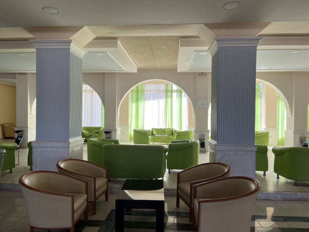 Położony na dużym, zadbanym terenie. Na terenie hotelu znajdują się baseny, plac zabaw dla dzieci, kort tenisowy i boisko do siatkówki na plaży. W budynku głównym znajduje się przestronne lobby i piękny taras, gdzie na wygodnym fotelu lub kanapie można odpocząć, nie tyle od upału co od słońca.