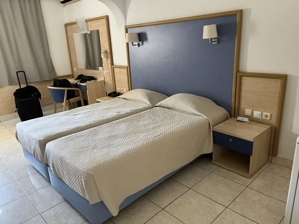 Zameldowanie w hotelu odbywa się zaraz po przyjeździe, a pokoje są udostępniane teoretycznie od godz. 15, choć my dostaliśmy pokój trochę wcześniej. Należy pamiętać, że w Grecji płaci się podatek turystyczny na miejscu przy zameldowaniu w hotelu.