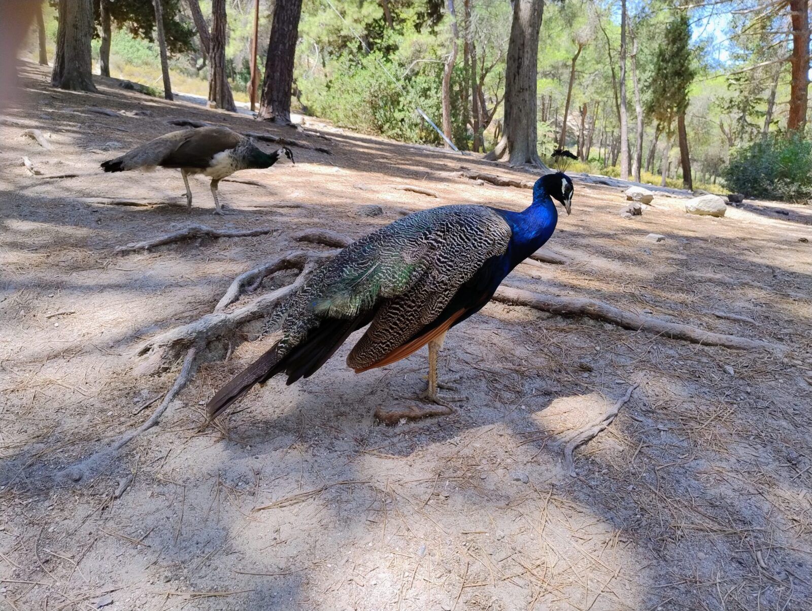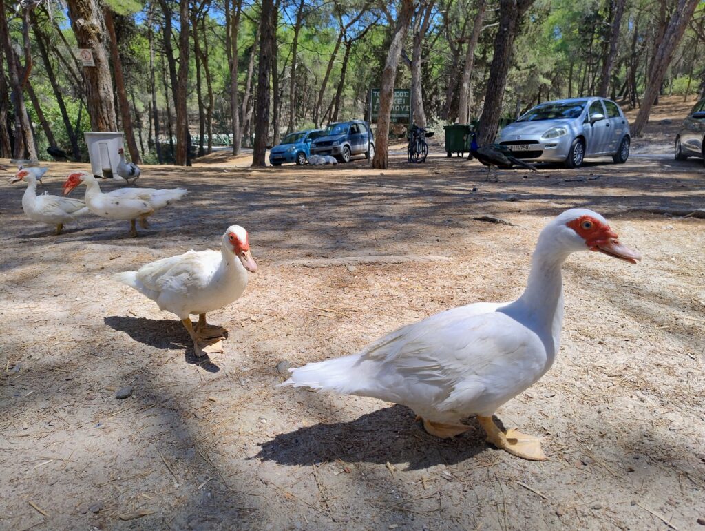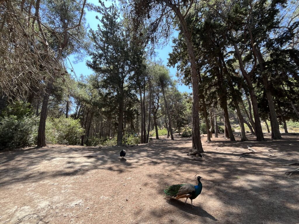 Plaka forest to las pełen dziko żyjących pawi. Jest ich tu mnóstwo. Są piękne, a ich pióra mienią się różnymi kolorami. Pawie są niezwykłą ozdobą tego lasu. Spacerują między drzewami, przyglądają się ludziom i odpoczywają w cieniu. Dorosłe pawie są przepiękne, ale najbardziej urocze są maluszki. Są tu też koty i kaczki. Na miejscu można kupić jedzenie dla pawi i je nakarmić. My karmiliśmy pawie soczystym arbuzem, którego dostaliśmy od starszego Greka.