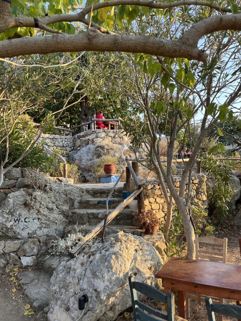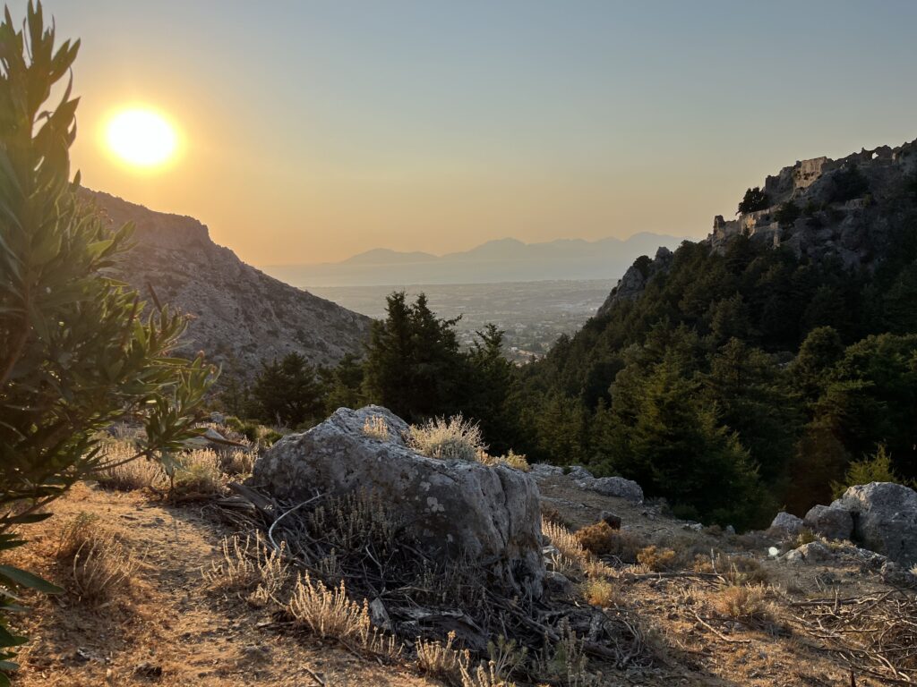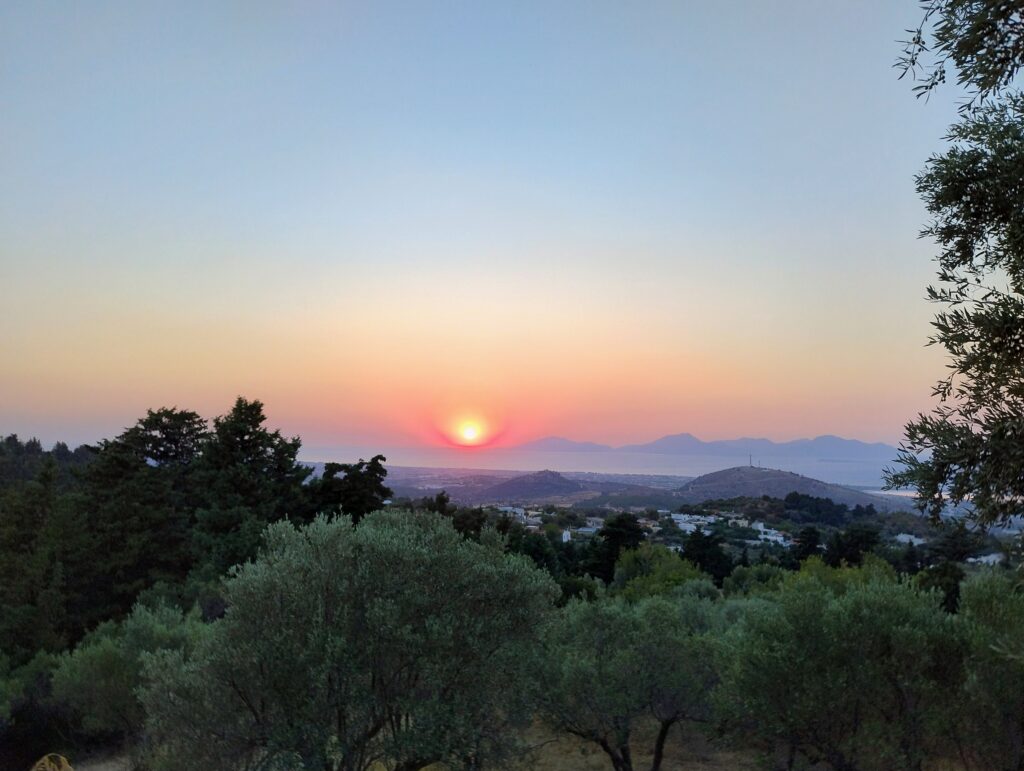 Jest tu bardzo cicho i pusto, ale pięknie. Nie jest to miejsce oblegane przez turystów. Wszechobecna cisza oraz pozostałości kamiennych domów i kaplic pozwalają wyobrazić sobie jak wyglądało tutaj codzienne życie w dawnych czasach. A w pobliżu ruin znajduje się klimatyczna tawerna „Orio Cafe„, z której rozpościera się jeden z najpiękniejszych widoków na Kosie. Idealne miejsce, by podziwiać zachód słońca. My złapaliśmy tutaj tę chwilę i zaraz pędziliśmy do wioski Zia. Jeśli chcecie zobaczyć przepiękny zachód słońca bez tłumu ludzi, to właśnie na tym wzgórzu. To miejsce wyjątkowe i dla nas najlepsze do odwiedzenia na Kos.