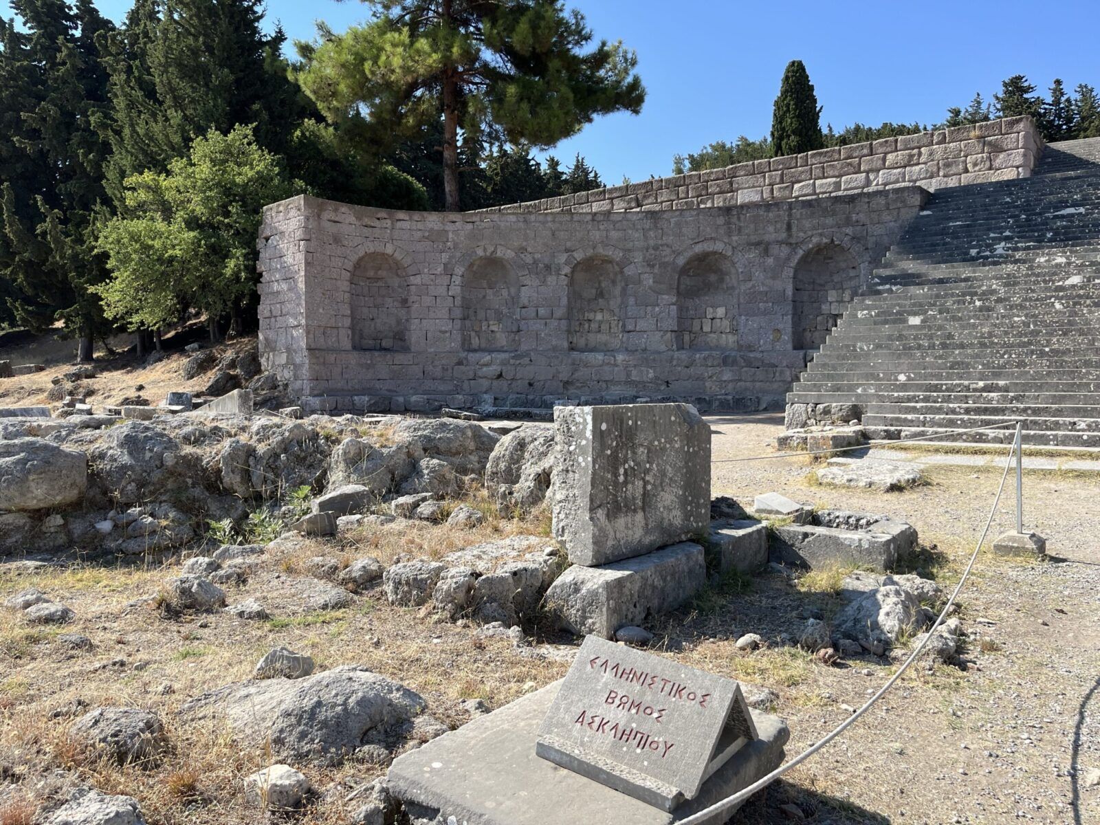Asklepiejon ze względu na górzyste ukształtowanie terenu został zbudowany i podzielony na trzy duże tarasy połączone szerokimi, marmurowymi schodami. Na najniższym poziomie Asklepiejonu znajdowała się szkoła lekarska, pomieszczenia dla chorych pacjentów i łaźnie rzymskie, w których zażywano leczniczych kąpieli, powyżej starożytny szpital i ośrodek zdrowia, a na najwyższym trzecim tarasie duża Świątynia Asklepiosa. To właśnie z tego miejsca rozciąga się przepiękny widok na miasto Kos, Morze Egejskie oraz Turcję. To miejsce warto odwiedzić, obejrzeć pozostałości starożytnej architektury oraz nacieszyć oczy pięknym widokiem na całą okolicę.