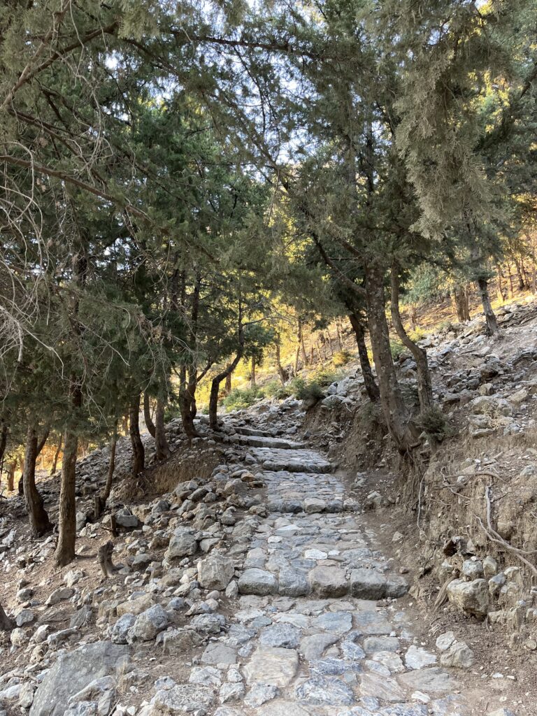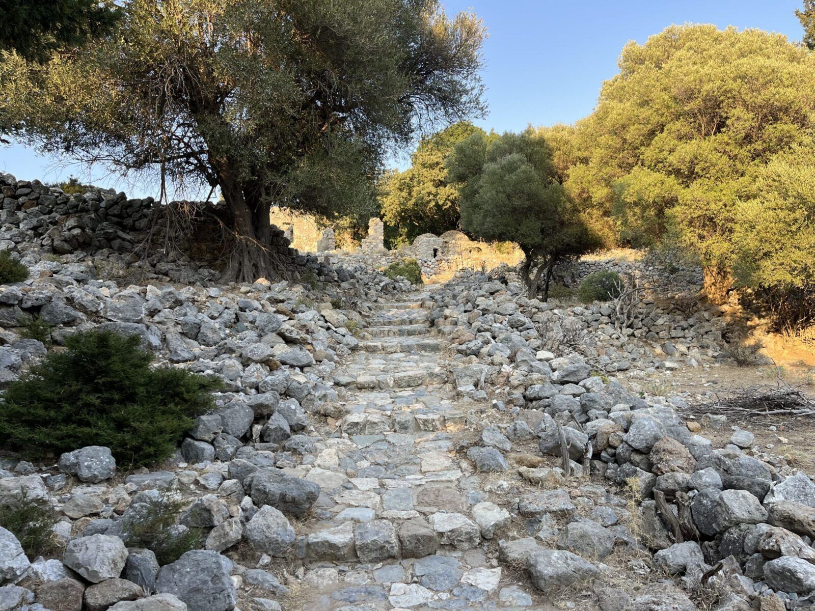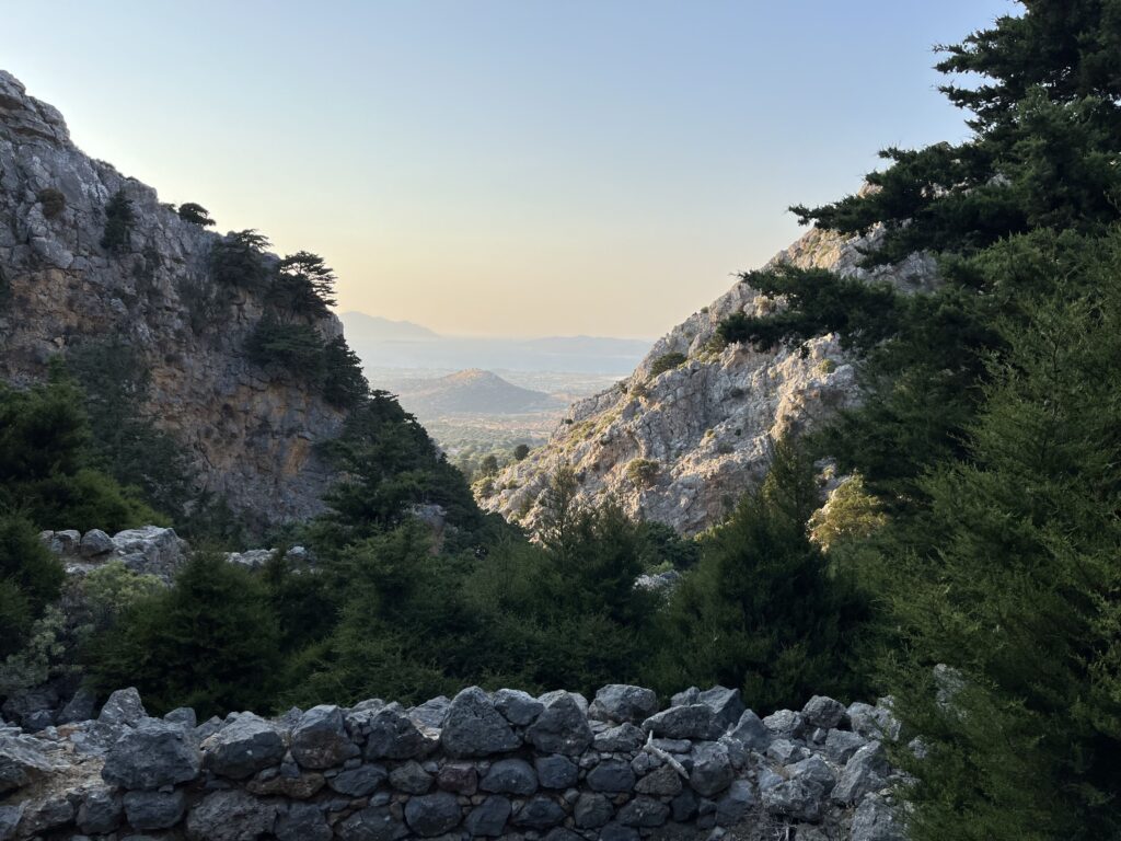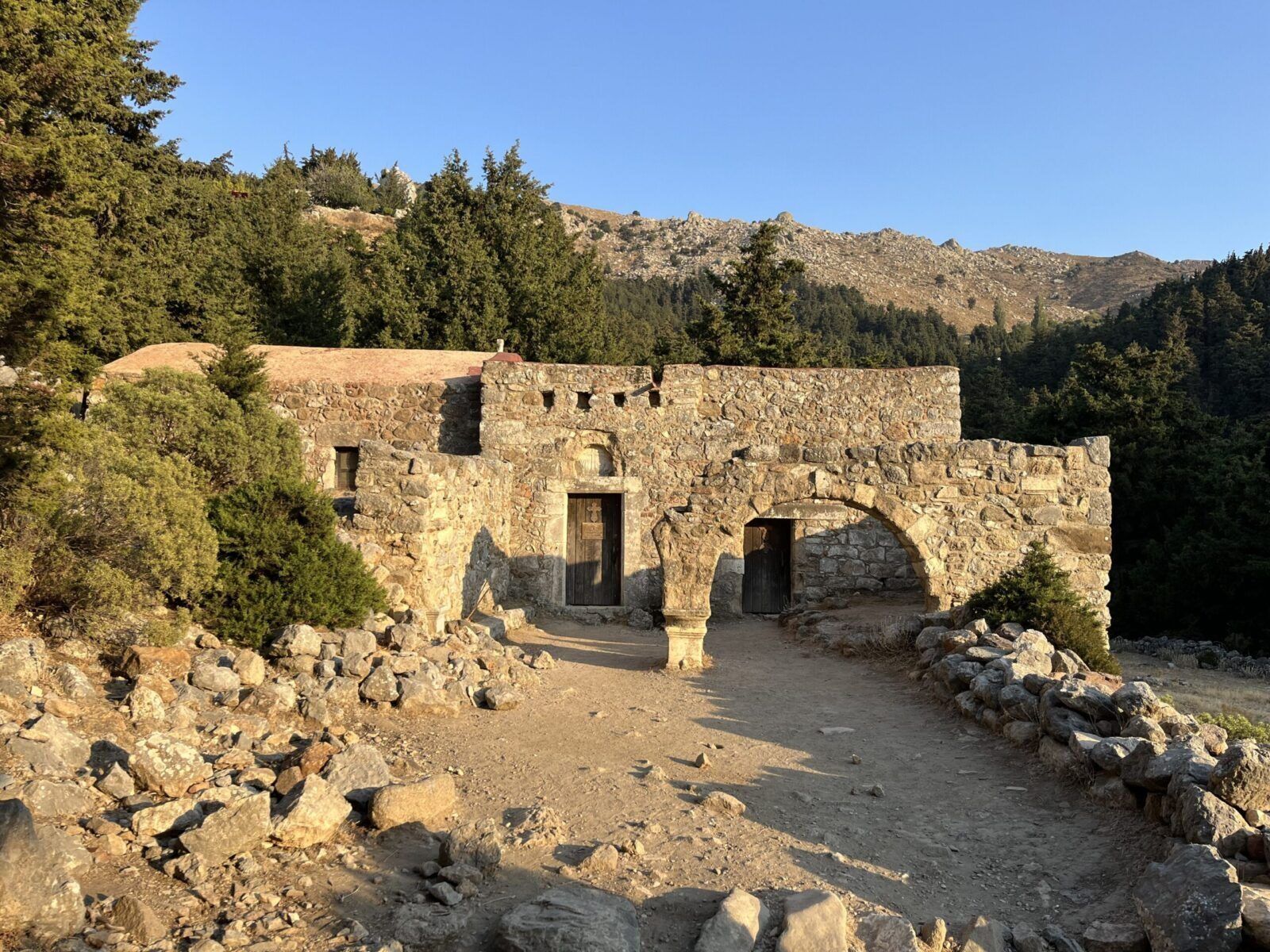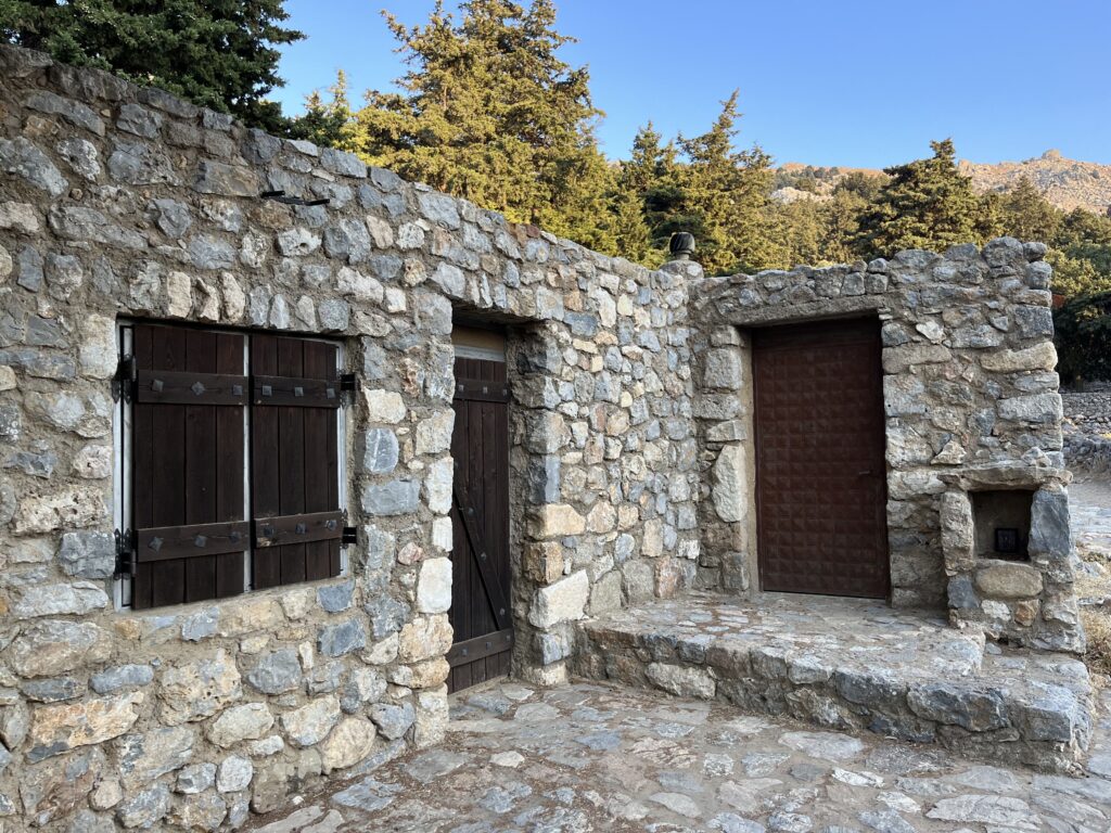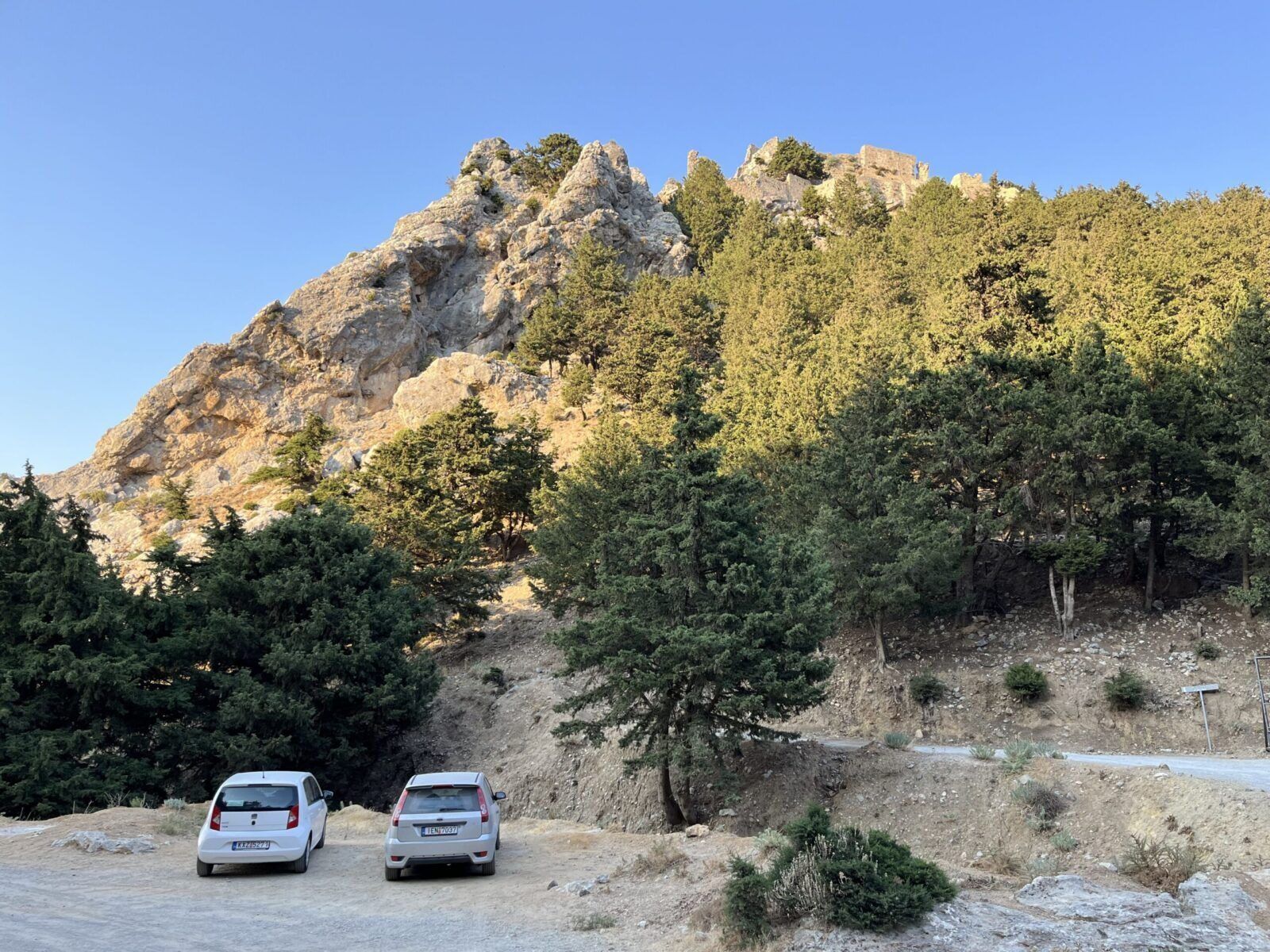 Byliśmy tu późnym popołudniem, gdy upał nie był już tak męczący. Wczesny ranek i późne popołudnie to idealna pora na zwiedzanie ruin zamku bizantyjskiego wzniesionego na wzgórzu, dwóch zabytkowych kaplic (Kaplica Panagia ton Kastrianon i Kaplica Agios Ioannis Theologosi) oraz położonej poniżej w lesie opustoszałej wioski. Wejście na górę, które trwa ok. 30 minut jest dość wymagające, ale naprawdę warto tu przyjechać. Wchodząc na szczyt po śliskich i nierównych kamieniach trzeba bardzo uważać , żeby się nie poślizgnąć (klapki oraz sandały są tu niewskazane).