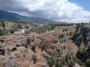 Dojazd do mostu niesamowicie malowniczą, krętą drogą pod górę. Na drodze kozy, które na Krecie widoczne są prawie wszędzie. Jedne biegają po skałach, inne odpoczywają w szczelinach skalnych, a kolejne siedzą na drodze. Widoki świetne.