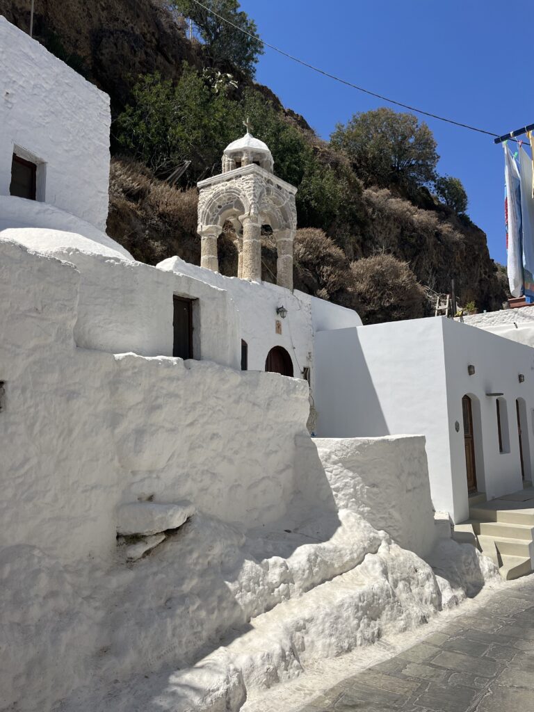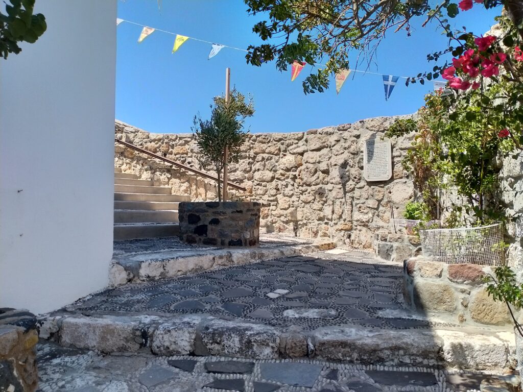 Będąc w Mandraki zwiedziliśmy również znajdujący się na wzgórzu dawny zamek zakonu Joanitów oraz klasztor Panagia Spiliani.