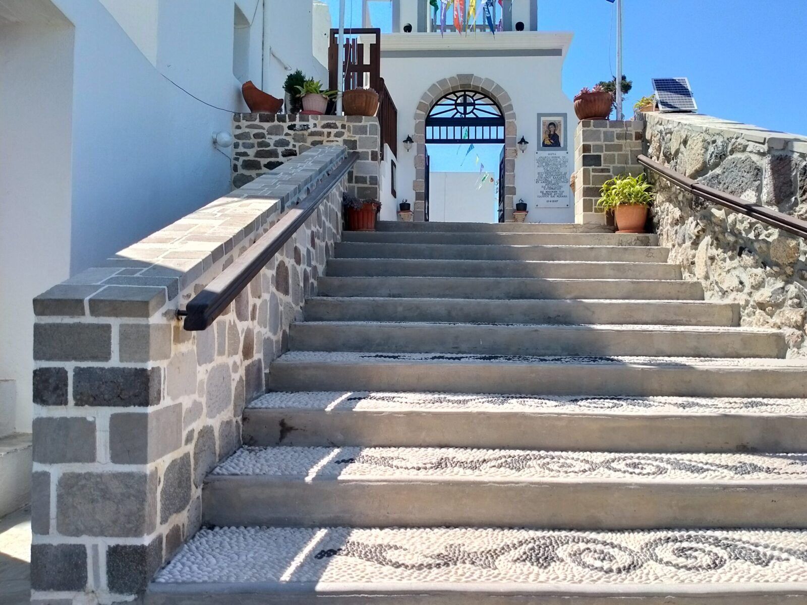 Do klasztoru prowadzą strome schody znajdujące się w centrum miasteczka, które nie tak łatwo jest znaleźć. Ze wzgórza roztacza się piękny widok na Mandraki i pełne słońca morze. Wstęp do klasztoru jest płatny. Wewnątrz klasztoru jest ikona, która została znaleziona w polu. Zgodnie z legendą została zaniesiona do kościoła i w cudowny sposób przeniosła się do jaskini. Tak przenosiła do jaskini się 3 razy. W końcu na cześć tej ikony wybudowano w tym miejscu klasztor. Każdego roku 15 sierpnia odbywają się tu uroczyste obchody Zaśnięcia Najświętszej Maryi Panny i przypływają tutaj statki z ludźmi z całej okolicy. Ta wielka fiesta pełna jest muzyki, tańca i radości.