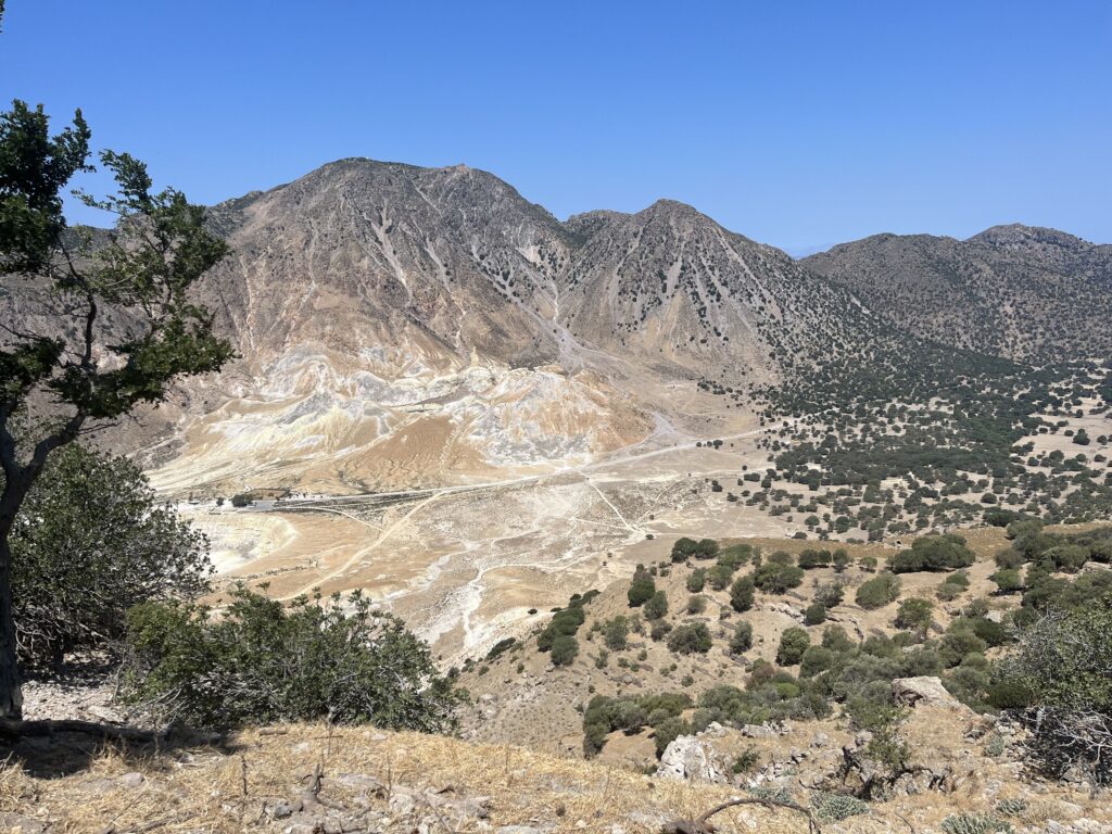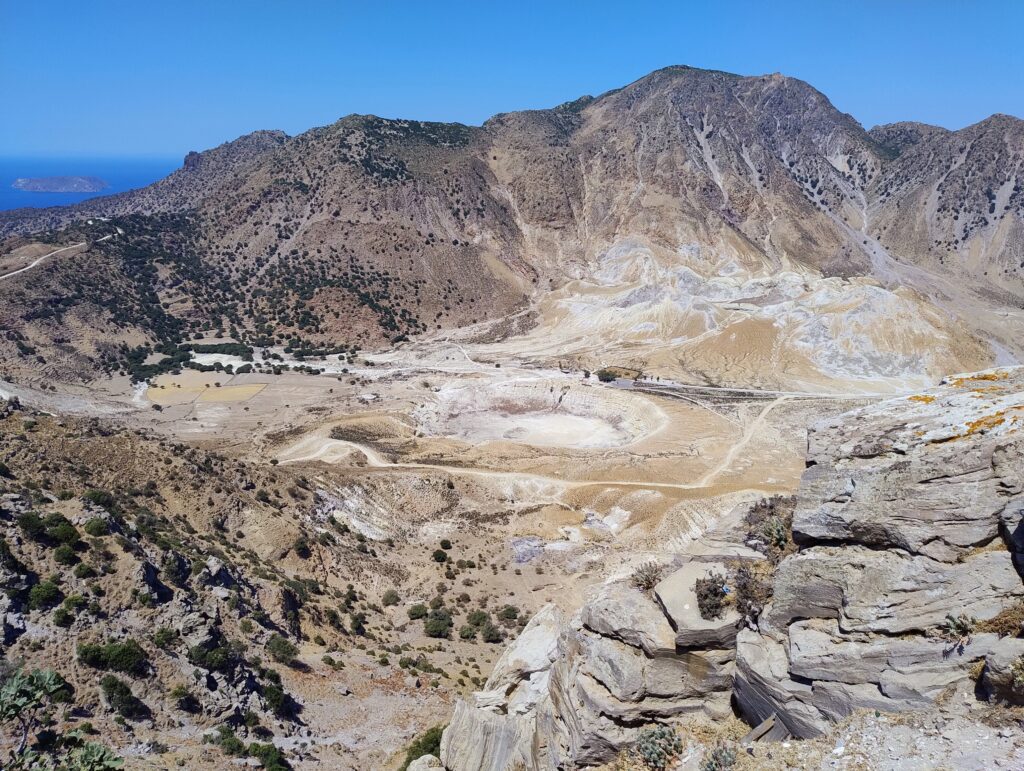Po dopłynięciu do portu Mandraki, ruszyliśmy autokarem zwiedzać tę śliczną, malutką, wulkaniczną wyspę. Zwiedzanie wyspy zaczęliśmy od wycieczki do krateru wulkanu Stefanos znajdującego się w centralnej części wyspy.