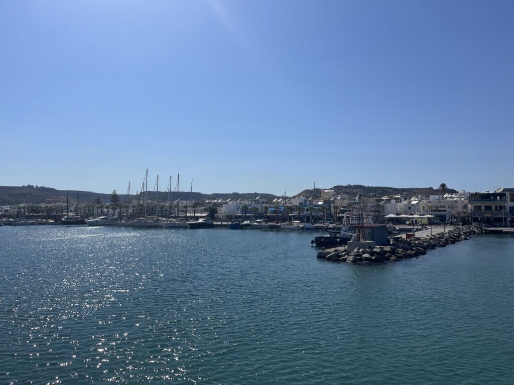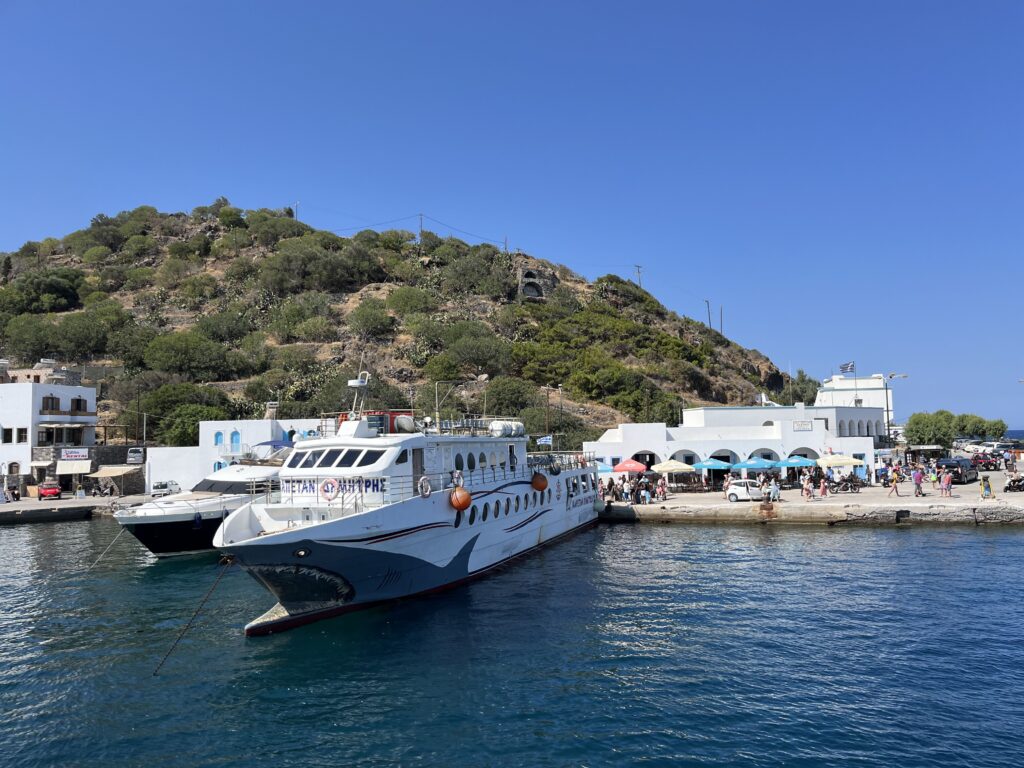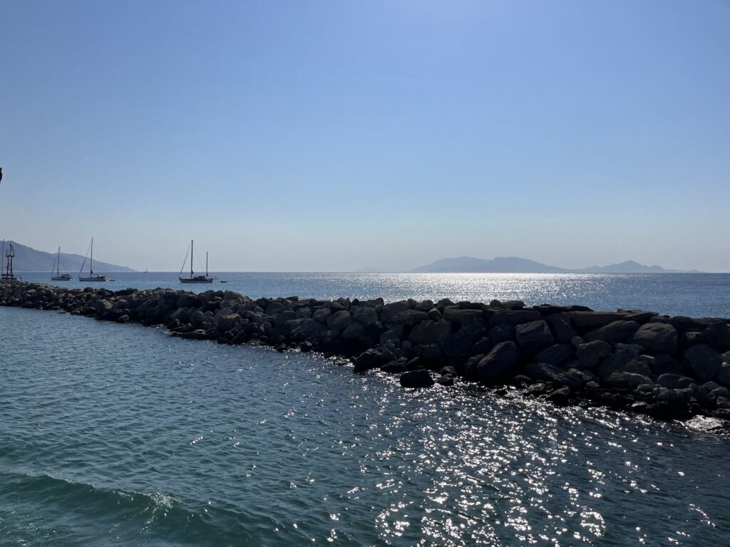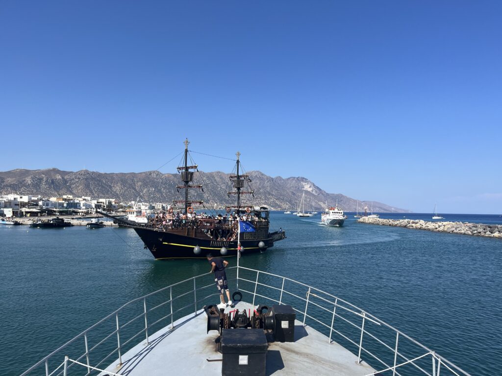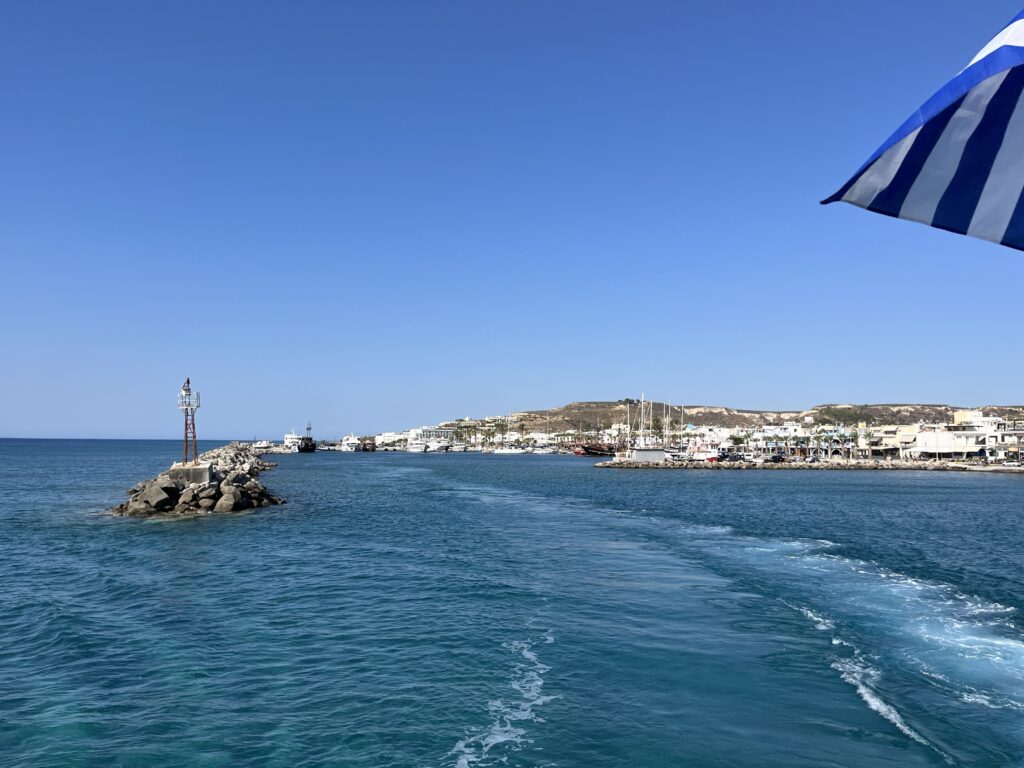 Na Nisiros popłynęliśmy statkiem z pięknego, małego portu w Kardamenie. To właśnie stąd wypływają wszystkie promy na Nisiros. My wybraliśmy rejs z polskim biurem wycieczkowym. Wyjechaliśmy busem spod naszego hotelu i dojechaliśmy do Kardameny, gdzie czekała na nas polska przewodniczka Marta. Poszliśmy do portu. Przed wejściem na statek musieliśmy opłacić wycieczkę. Dostaliśmy bilety na prom i na autokar. Wypłynęliśmy w godzinny rejs na Nisiros.