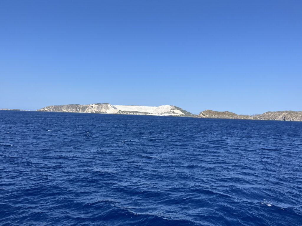 Podczas rejsu statkiem przepływaliśmy obok białych wzgórz wyspy Jali. To z tych białych skał na Jali wydobywa się naturalny pumeks.