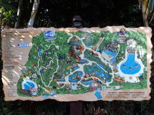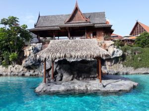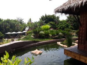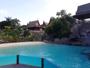 Po zaparkowaniu auta w bezpłatnym miejscu i przejściu linii kas, było jedno wielkie „wow”. Już od wejścia było cudownie. Park w stylu tajskim. Tuż za wejściem przywitały nas foki pływające w basenie z lazurową wodą. Dalej zobaczyliśmy sklepiki z pamiątkami i przekąskami postawione na palach wystających z wody, na wzór tajskiej wioski.