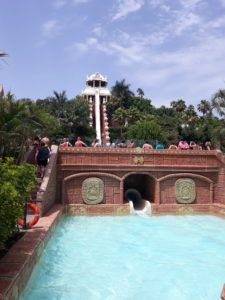 Atrakcji całe mnóstwo. Każdy znajdzie tu coś dla siebie. Myślę jednak , że największą rozrywką są tu zjeżdżalnie o różnej wysokości, długości i kątach nachylenia. Najdłuższa i najbardziej stroma zjeżdżalnia „ The Tower of Power ” też cieszyła się dużym zainteresowaniem. Według mnie to zjeżdżalnia dla najodważniejszych i według mnie nie jest do końca bezpieczna. Jedzie się z niej leżąc na plecach, a na samym końcu trzeba bardzo uważać, żeby nie podnieść głowy, bo przejeżdża się przez niewysoki tunel i można stracić głowę. I nikt mi nie powie, że to jest bezpieczne. Chwila nieuwagi i nieszczęście gotowe. Mąż z córką zjechali z niej na samym początku i ja o tym nawet nie wiedziałam, bo nigdy nie zgodziłabym się na to, aby moje dziecko tu zjechało. Oni chyba o tym wiedzieli i pobiegli tam od razu na samym początku.