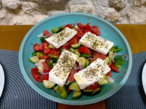 Po wizycie na targu w Rethymno, przygotowałam dla swojej rodziny sałatkę grecką ze świeżutkich, pachnących warzyw, sera feta, ziół i oliwy. Pyszności.